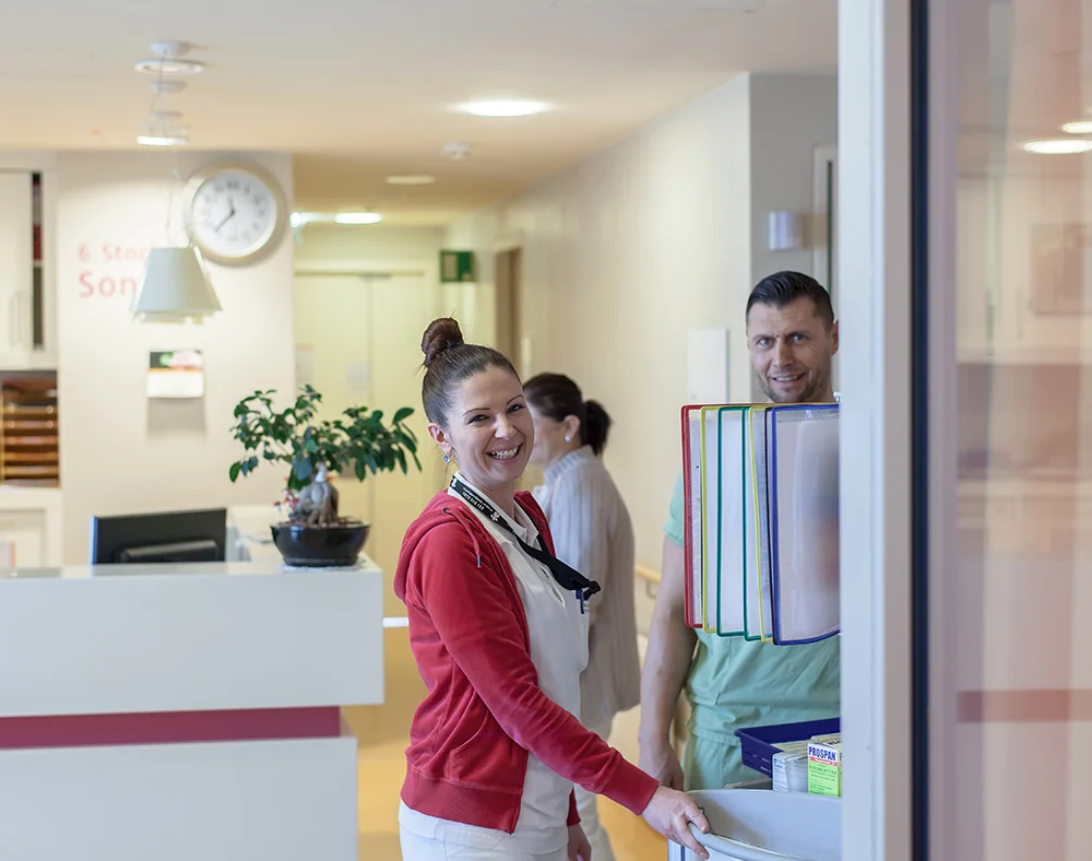 „Ich bin seit 29 Jahren im Haus und schätze nach wie vor alles hier. Die Zusammenarbeit mit den Berufsgruppen und der PDL läuft sehr gut. Arbeitsmaterial ist immer vorhanden, die Infrastruktur passt, und bei Engpässen unterstützt Pool-Personal. Das Arbeitsklima ist durchwegs positiv.“